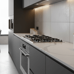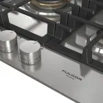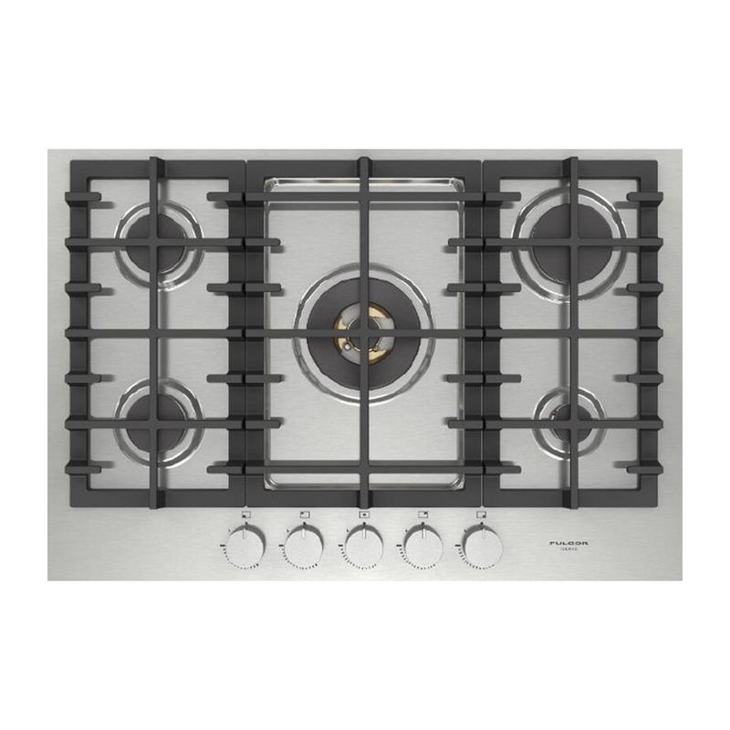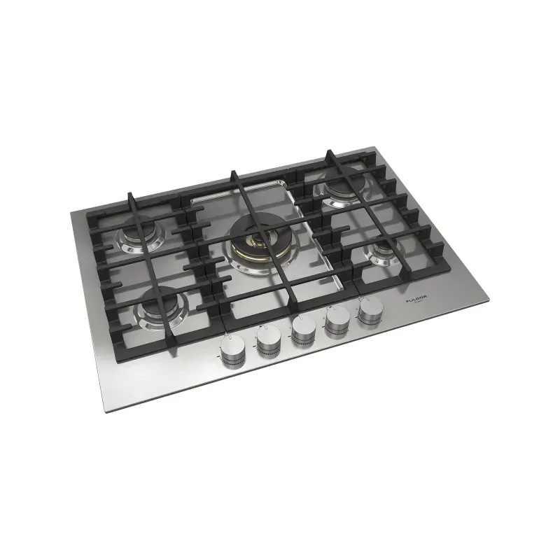 La encimera de 75 cm tiene mandos de metal con tuerca anular y 5 hornillos con difusores de llama de latón. Incluyen un wok de 4 kw en posición central. Las parrillas suministradas son de hierro fundido con una superficie continua, garantizando así la máxima seguridad y comodidad al desplazarse las sartenes entre los distintos quemadores. La seguridad también está garantizada por la presencia de termopares que interrumpen las fugas accidentales de gas