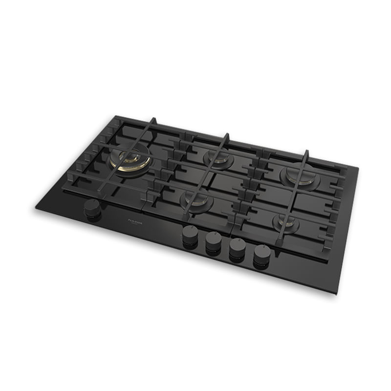 La encimera de 90 de diseño único y distintivo presenta un cristal negro o blanco, mandos metálicos con virola y 5 hornillos con divisores de llama de latón. Incluyen un wok de 4,0 kw en el lado izquierdo. Las parrillas suministradas son de hierro fundido con una superficie continua, garantizando así la máxima seguridad y comodidad al desplazamiento de las sartenes entre los distintos hornillos.