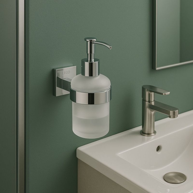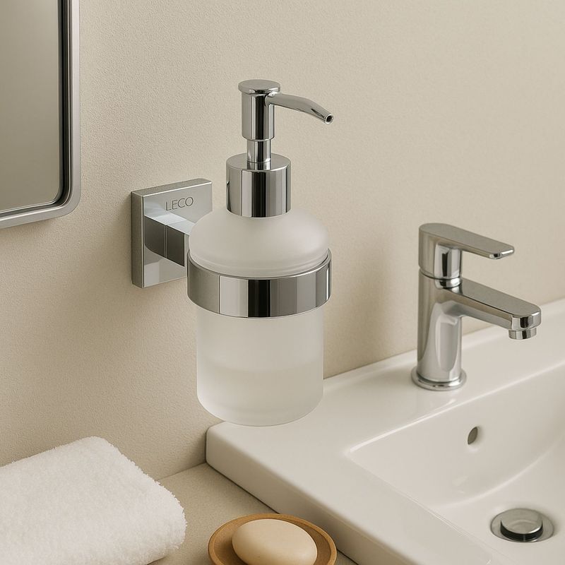 Dispensador de jabón líquido en vidrio con un sistema de sujeción metálica. Un complemento ideal en el baño por su gran funcionalidad. Sistema de fijación oculta que evita la acumulacion de impurezas y facilita la limpieza. Un accesorio combinable con las demás piezas de la colección livorno.