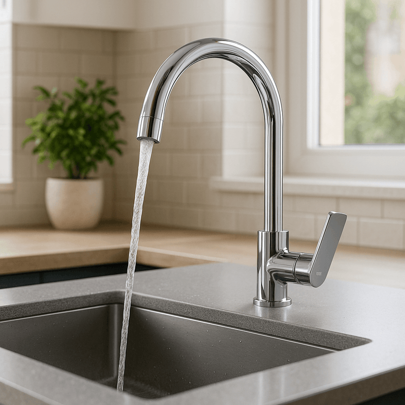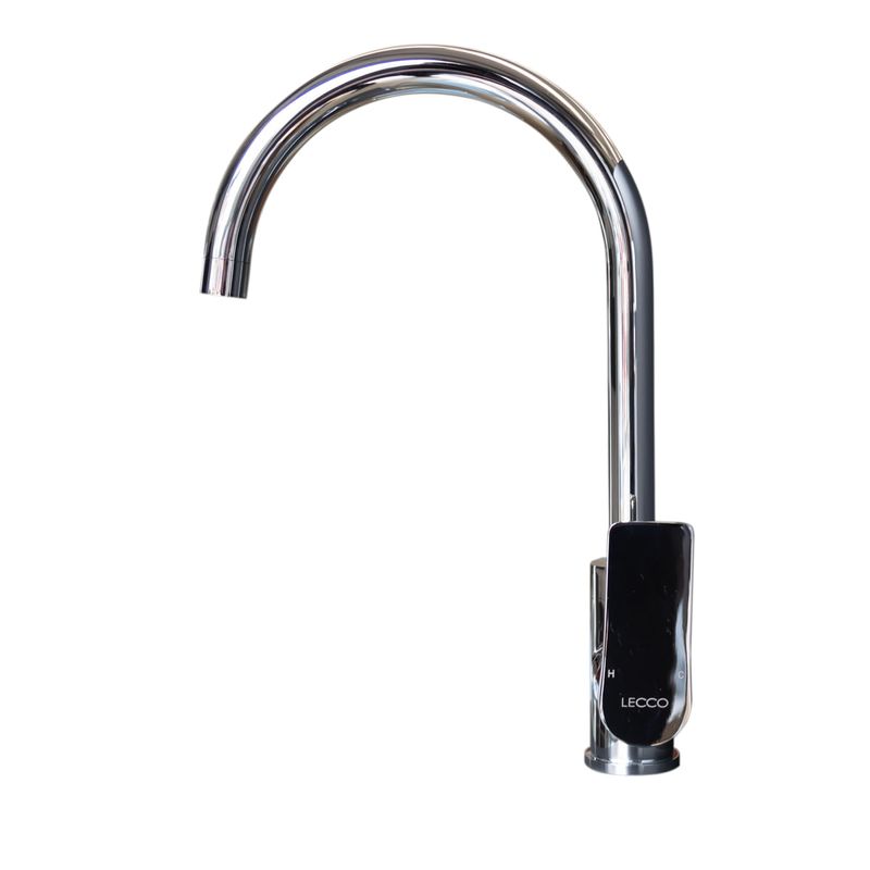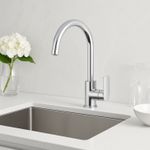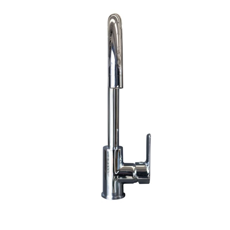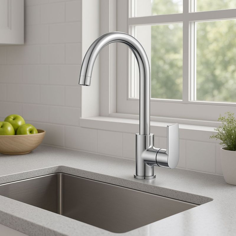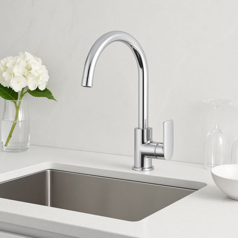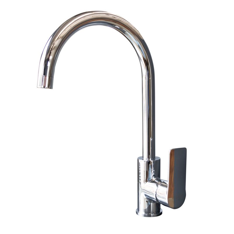Grifería para lavaplatos metálica acabado cromo, diseño con líneas curvas y orgánicas que evocan un estilo contemporáneo. Su cuello elevado móvil facilita la labor diaria en la cocina. La manija permite una suave y rápida manipulación para mezclar el agua caliente y fría en menos de un cuarto de giro. Esta grifería cuenta con un sistema de aireador que permite obtener un chorro de agua espumoso. Es un producto de fácil limpieza, resistente al rayado y a la corrosión.
