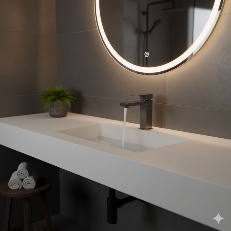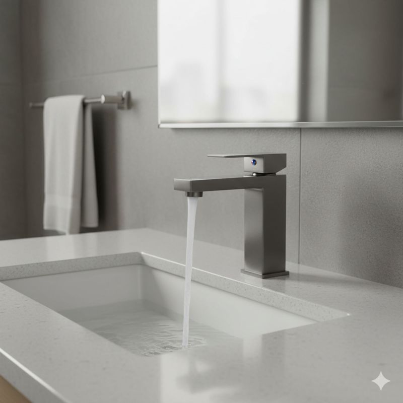 Grifería para lavamanos en acero inoxidable acabado grafito con diseño moderno y contemporáneo de ángulos rectos que la convierten en una pieza decorativa y estética dentro del baño. Su cuerpo bajo es ideal para diseños de lavamanos como placas de sobreponer, suspendidos y empotrados. Esta grifería cuenta con un sistema de aireador que permite obtener un chorro de agua espumoso y también un ahorro de agua. Es un producto de fácil limpieza, resistente al rayado y a la corrosión.