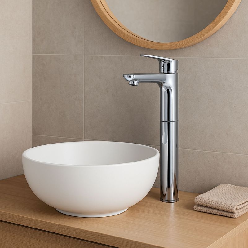 Grifería ultra ahorradora ( lts por minuto) para lavamanos metálica cromada con diseño moderno y contemporáneo de ángulos redondeados que la convierten en una pieza decorativa y estética dentro del baño. Su cuerpo alto es ideal para lavamanos tipo vessel. Esta grifería cuenta con sistema de aireador que permite obtener un chorro de agua espumoso y también un ahorro de agua. Es un producto de fácil limpieza, resistente al rayado y a la corrosión