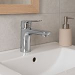 Grifería ultra ahorradora ( lts por minuto) para lavamanos metálica cromada con diseño moderno y contemporáneo de ángulos redondeados que la convierten en una pieza decorativa y estética dentro del baño. Su cuerpo bajo es ideal para diseños de lavamanos como placas de sobreponer, suspendidos y empotrados. Esta grifería cuenta con sistema de aireador que permite obtener un chorro de agua espumoso y también un ahorro de agua. Es un producto de fácil limpieza, resistente al rayado y a la corrosión