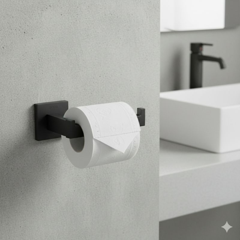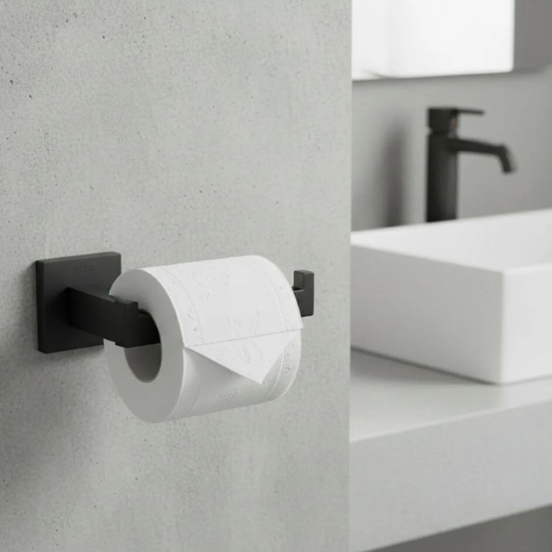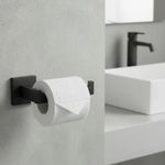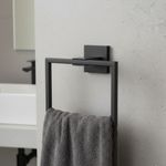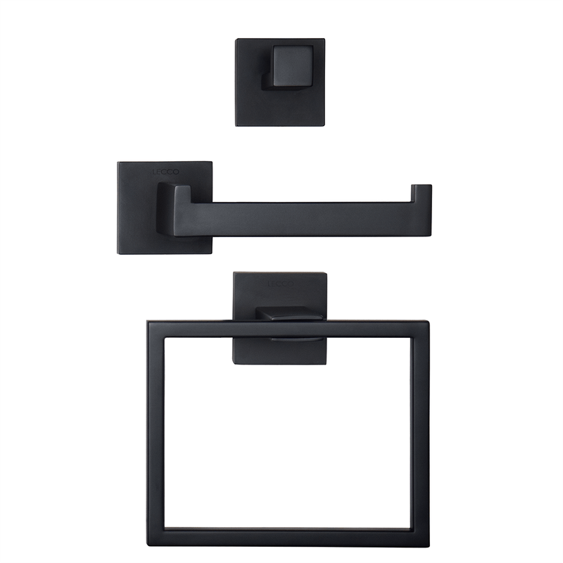 Juego de accesorios para baño negros en acero inoxidable: incluye toallero tipo argolla, porta rollo y percha. Su acabado negro con fijación oculta aporta un estilo moderno y elegante. Complementos imprescindibles para un baño funcional y con diseño.
