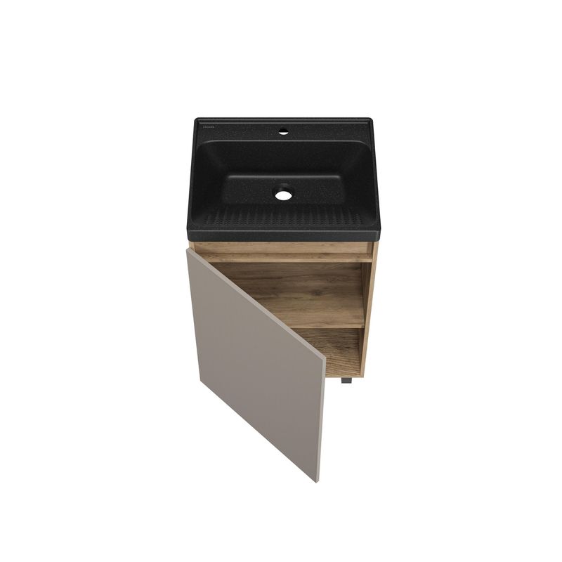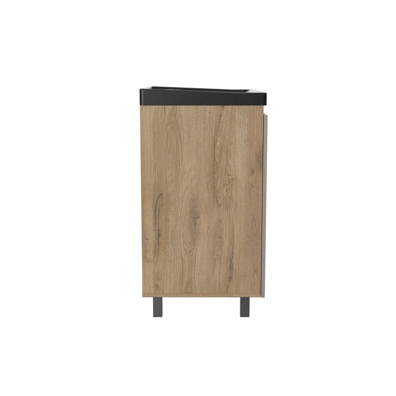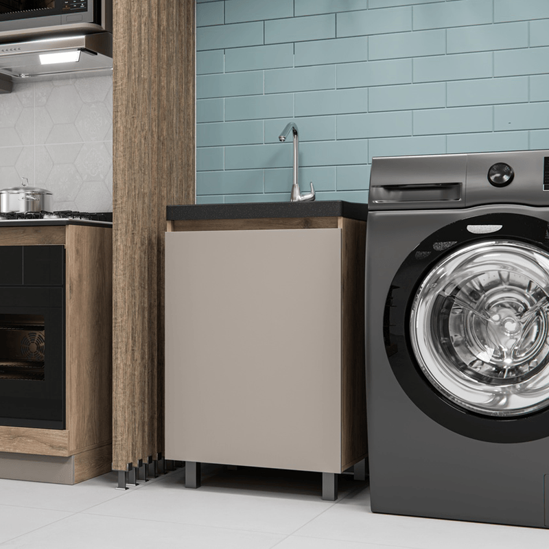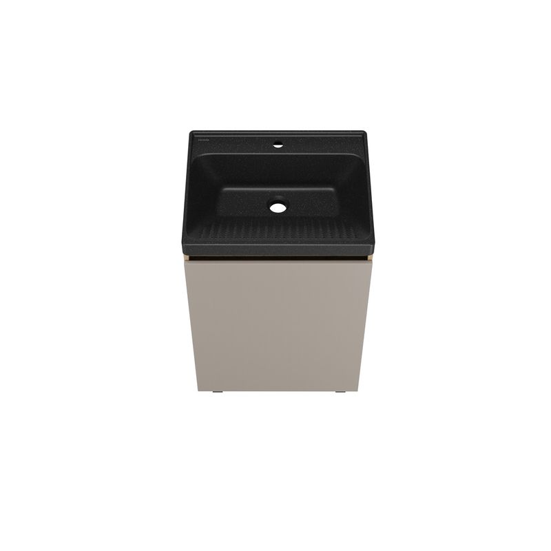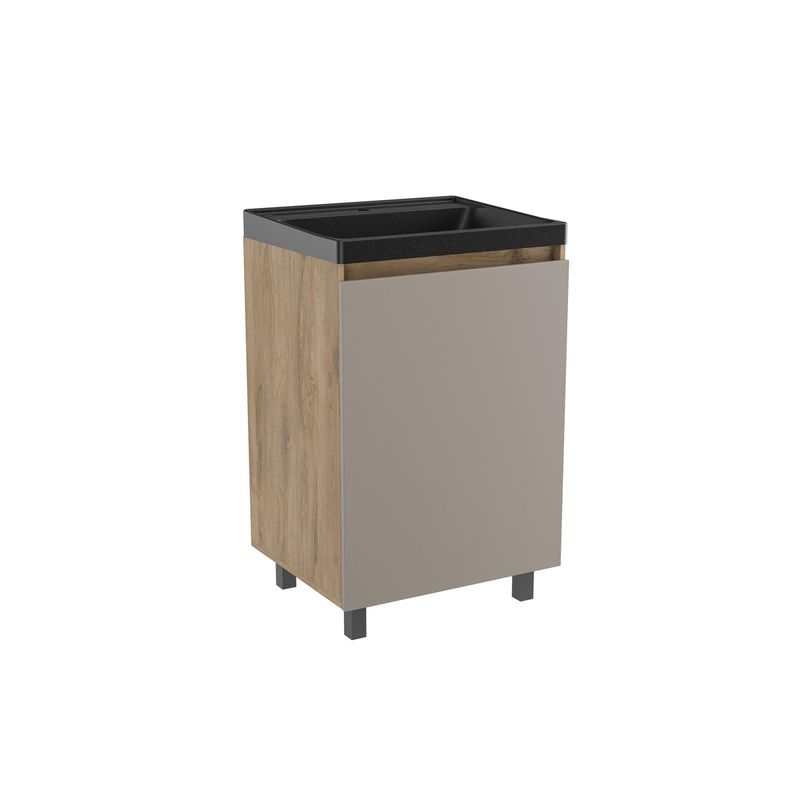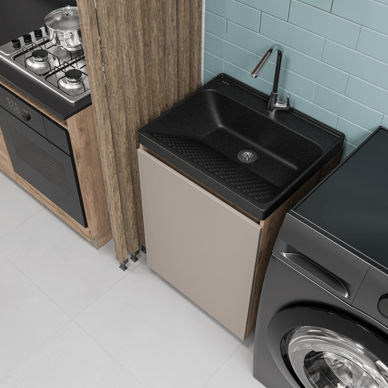 Lavadero premiun ii en porcelana color nergro estrellado con mueble en acabado madera colro macadamia con frente en color taupe. Ideal para espacios modernos y funcionales.