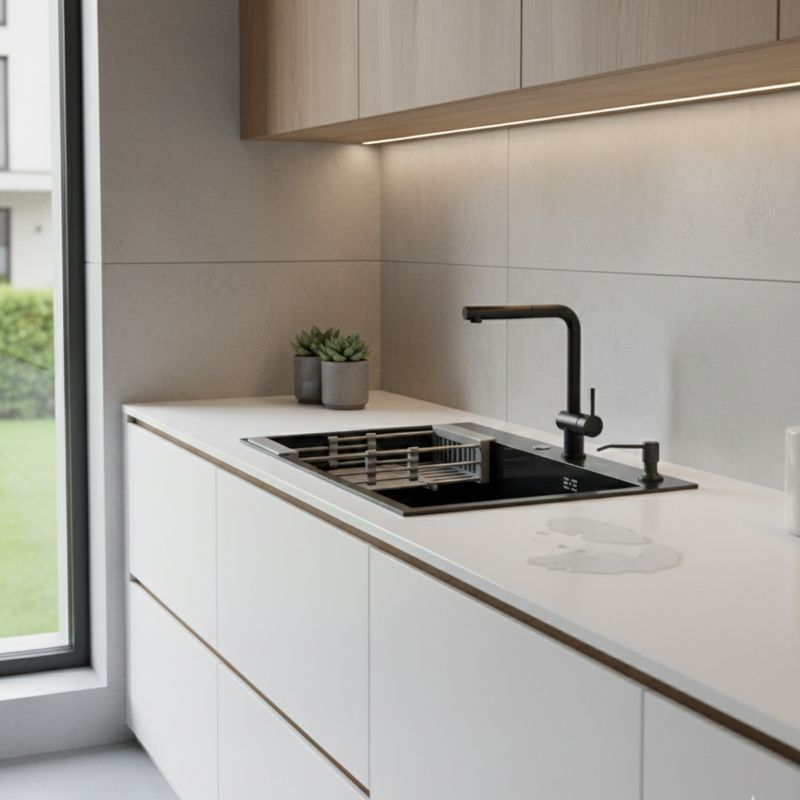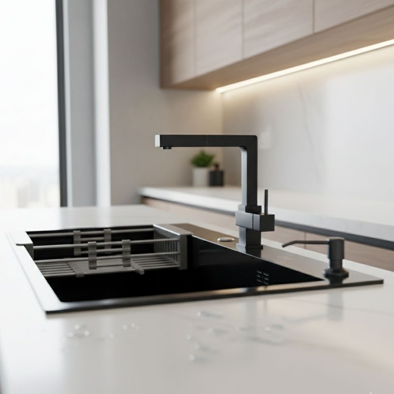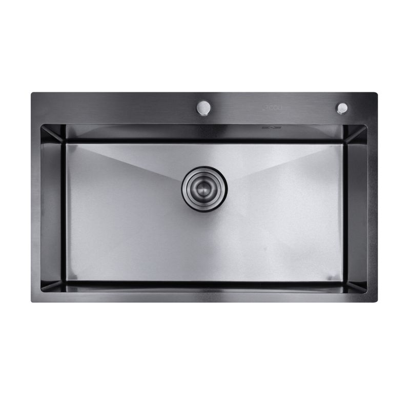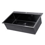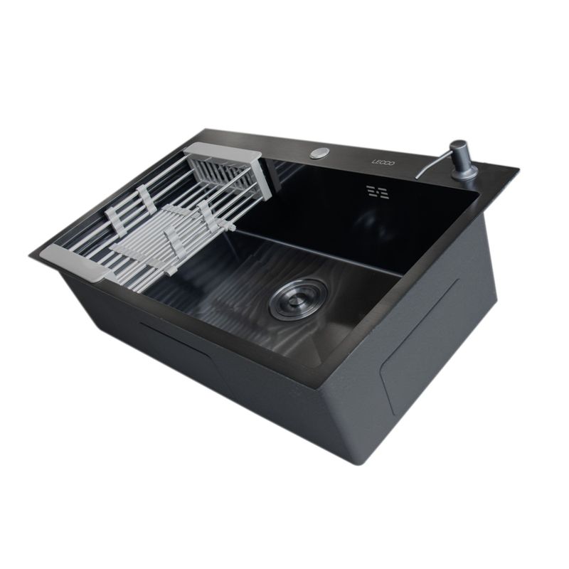 Lavaplatos en acero inoxidable con acabado negro para sobreponer encima del mesón de cocina. Su diseño moderno y funcional con sello antihumedad y sistema antiruido y una poceta profunda de 21.4, cm, lo convierten en un objeto decorativo y estético dentro de la cocina. Incluye dispensador de jabón, escurridor de verduras que se acoplan al espacio interno del lavaplatos. Kit de instalación incluido: canastilla y sifón.