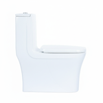 Sanitario one piece de bajo consumo de agua y alto poder de descarga con diseño compacto y contemporáneo que combina la eficiencia y la optimización del espacio. Tiene un bajo consumo de agua de 4.8 Lts promedio por descarga y una capacidad de evacuación de 1000 gramos. Cuenta con asiento de cierre suave para mayor comodidad y sifón esmaltado evitando la devolución de olores y posibles taponamientos. Fabricado en porcelana sanitaria de fácil limpieza e incluye anillo de cera para su instalación